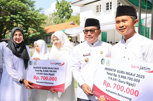 Bukan hanya karena ribuan santri memenuhi halaman Kantor Bupati dengan lantunan selawat dan semangat kebersamaan, tapi juga karena ada kabar gembira dari Bupati Banyuwangi, Ipuk Fiestiandani, yang menyalurkan insentif senilai Rp9,96 miliar kepada 14.241 guru ngaji di seluruh penjuru kabupaten.
